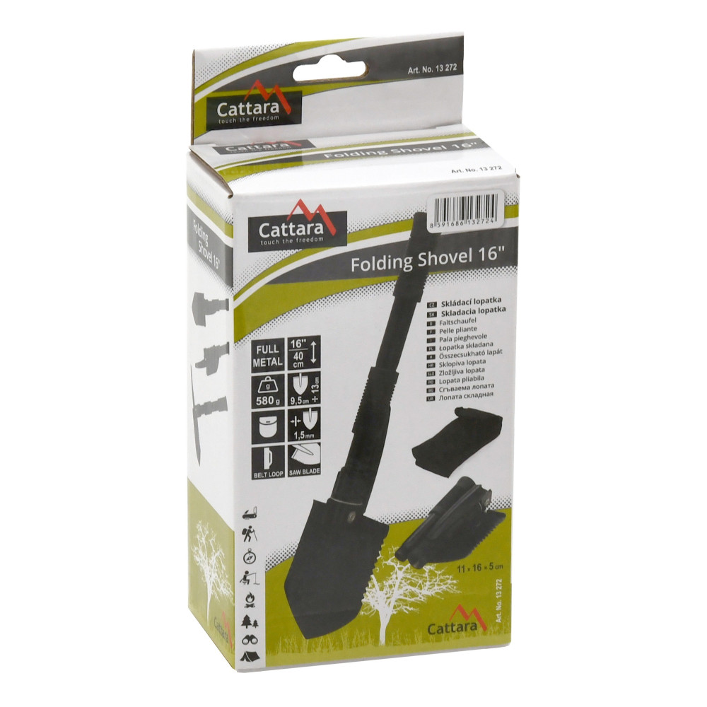 Jedná se o lopatku, která má rozměry ve složeném stavu 9,5 x 16 cm a prodávána je spolu s odolným textilním pouzdrem zelené barvy, které lze připevnit za opasek.