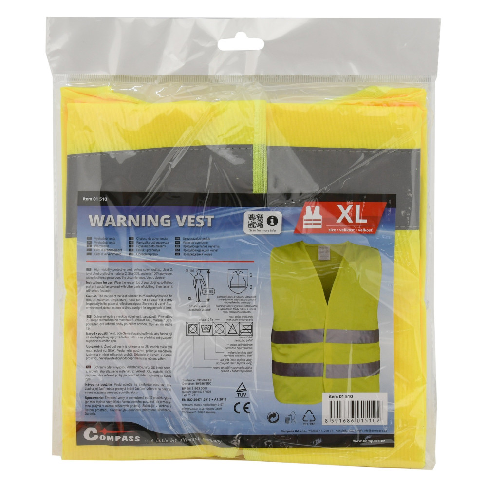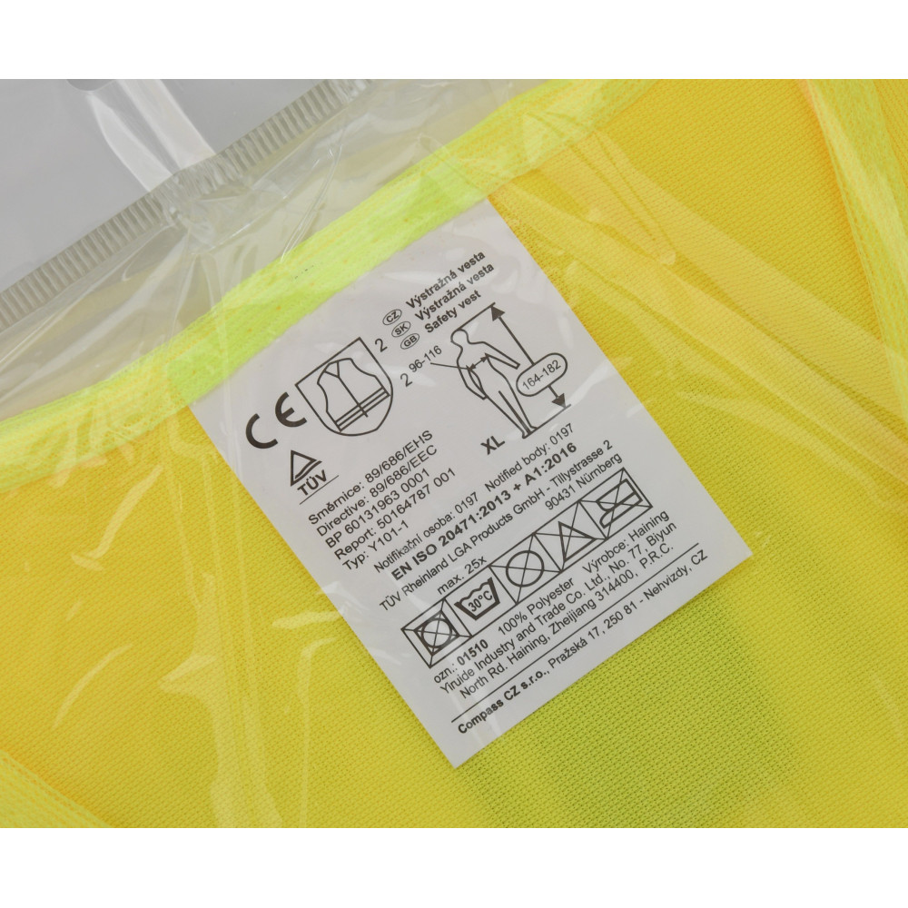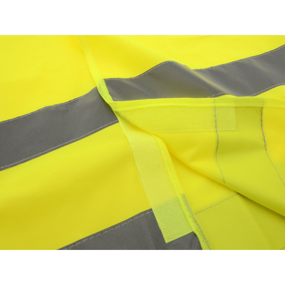 Výstražná reflexní vesta (ochranný oděv s vysokou viditelností) se zapínáním na suchý zip. Dva reflexní pruhy po celém obvodu, žlutá barva.
