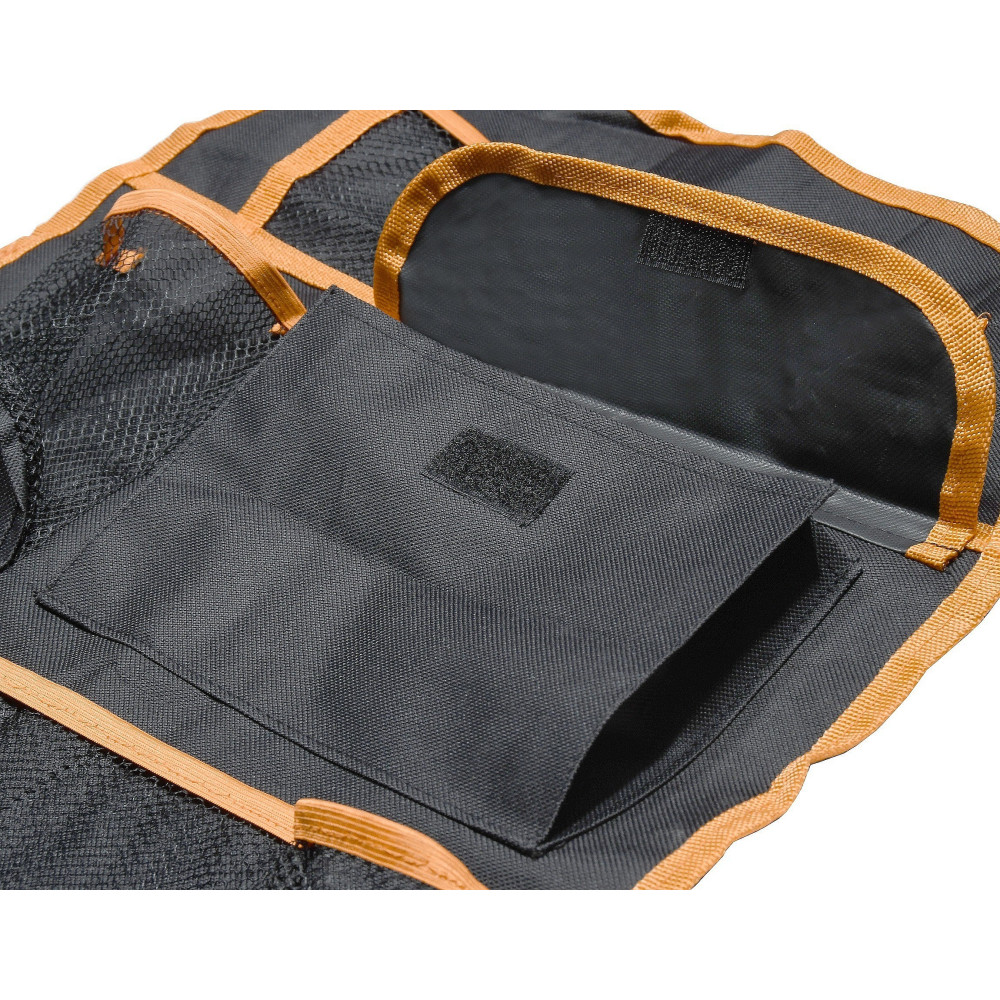 Disponuje kapsami, sítěnými přihrádkami, držáky na lahve a uzavíratelnou kapsou na suchý zip. Organizér je zhotoven ze 100% polyesteru, kvalitně obšitého oranžovým lemem.