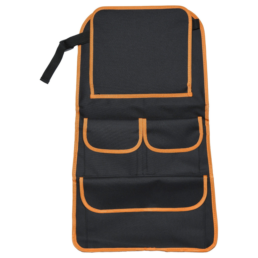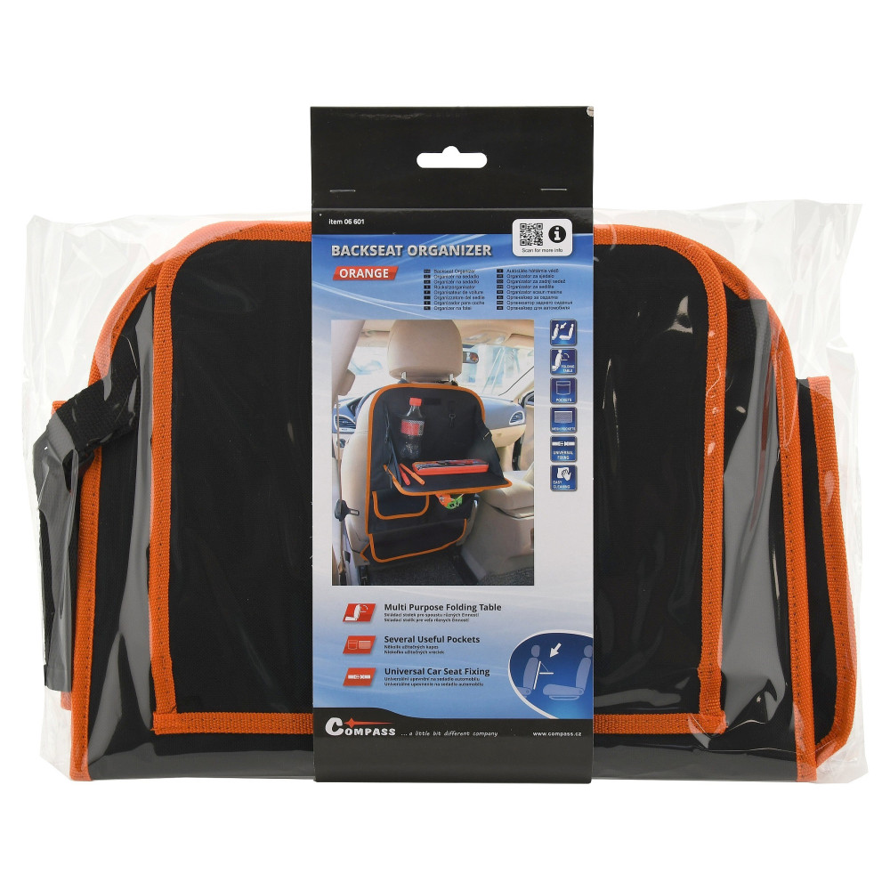 Organizér s rozměry 40,5 x 69,5 cm chrání sedadlo před znečištěním a je zhotoven ze 100% polyesteru, kvalitně obšitého oranžovým lemem. Snadno a rychle se uchycuje na zadní stranu přední sedačky automobilu pomocí nastavitelného popruhu s klipem a pomocí provázků.