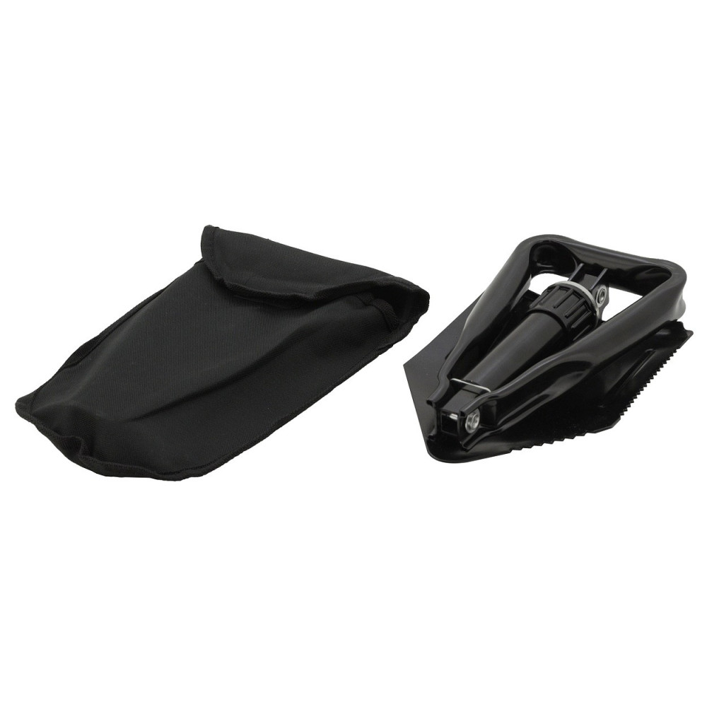 Lopatka má rozměry ve složeném stavu 15 x 24 cm a prodávána je spolu s odolným textilním pouzdrem černé barvy, které lze připevnit za opasek.