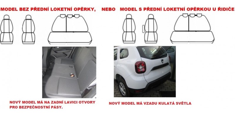 Autopotahy na DACIA DUSTER II., od r. 2018 - 2021. Potahy předních sedadel, zadní opěradlo dělené za spolujezdcem, zadní lavice nedělená, 5 opěrek hlavy, zipy na kapsy, úprava pro systém airbag. U řidiče může být loketní opěrka.