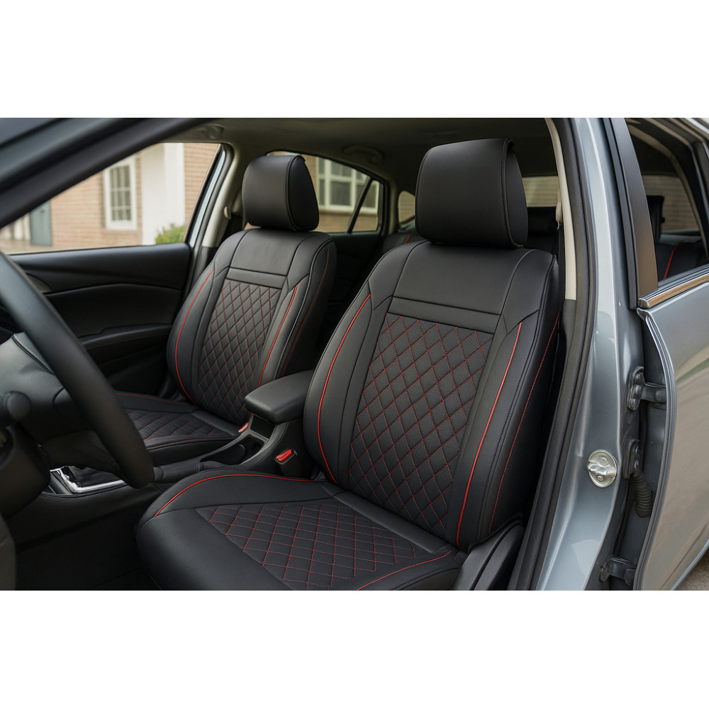 Univerzální autopotahy, sada pro přední sedadla. Eko kůže. Homologovány pro boční airbagy. Včetně opěrek hlavy. Černo-červená barva.
