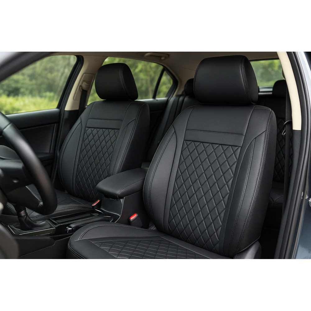Univerzální autopotahy, sada pro přední sedadla. Eko kůže. Homologovány pro boční airbagy. Včetně opěrek hlavy. Černá barva.