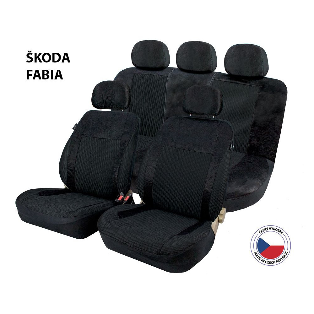 Autopotahy Perfetto pro Škoda Fabia, semi-speciál. Prošívaný a semišový polyester + pěna (0,5cm), pro nedělená i dělitelná zadní sedadla v poměru 1/3–2/3. Včetně opěrek hlavy, homologováno pro boční airbagy. Vhodné pro 3 bezp. pás.