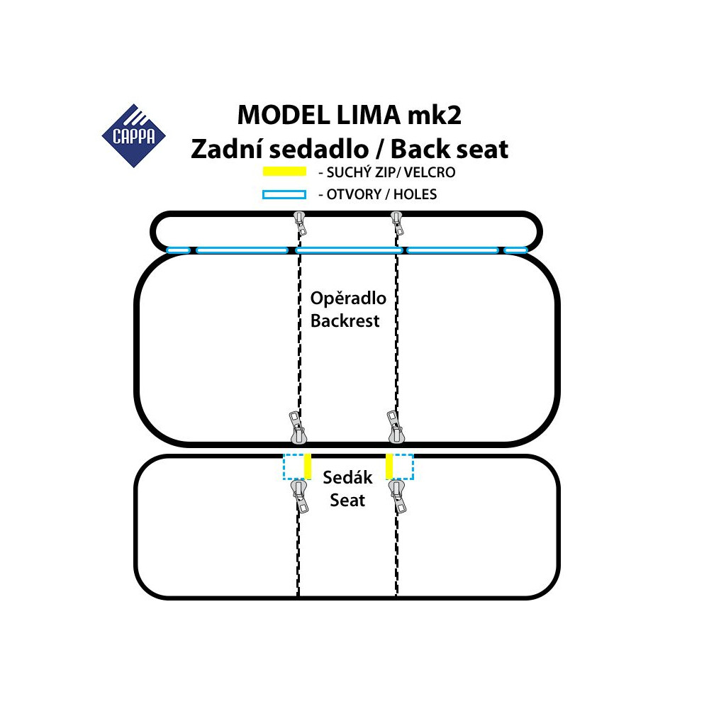 Střih LIMA je revoluční design firmy CAPPA pro zajištění maximální univerzálnosti potahu. Zámky pásů můžete vést skrze jeden ze tří otvorů v závislosti na tvaru sedáku, opěrky hlavy a 3. bezpečnostní pás mají připravené prostorné otvory a zipy na vrchní straně opěradla. Pro pásy zabudované přímo v zadním opěradle jsou na krajích také připravené otvory.