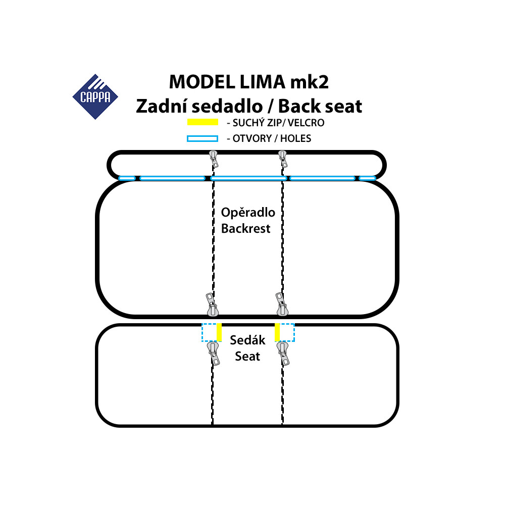 Střih LIMA je revoluční design firmy CAPPA pro zajištění maximální univerzálnosti potahu. Zámky pásů můžete vést skrze jeden ze tří otvorů v závislosti na tvaru sedáku, opěrky hlavy a 3. bezpečnostní pás mají připravené prostorné otvory a zipy na vrchní straně opěradla. Pro pásy zabudované přímo v zadním opěradle jsou na krajích také připravené otvory.