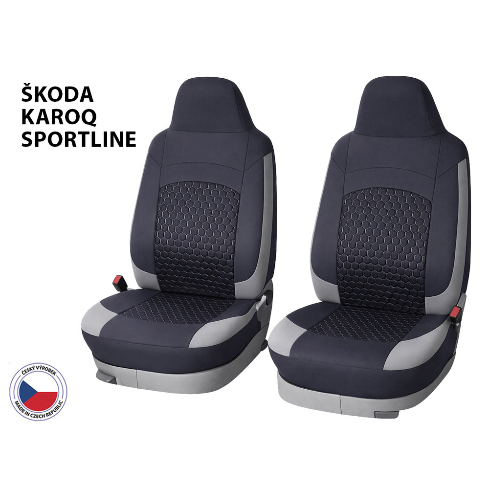 Autopotahy řady Perfetto pro Škoda Karoq Sportline, přední sedadla vozidla (2 místa), semi-speciál. Vyrobeny z polyesteru s pěnovou výplní pro vyšší komfort. Vhodné pro sedadla s integrovanými nebo vyjímatelnými opěrkami hlavy.