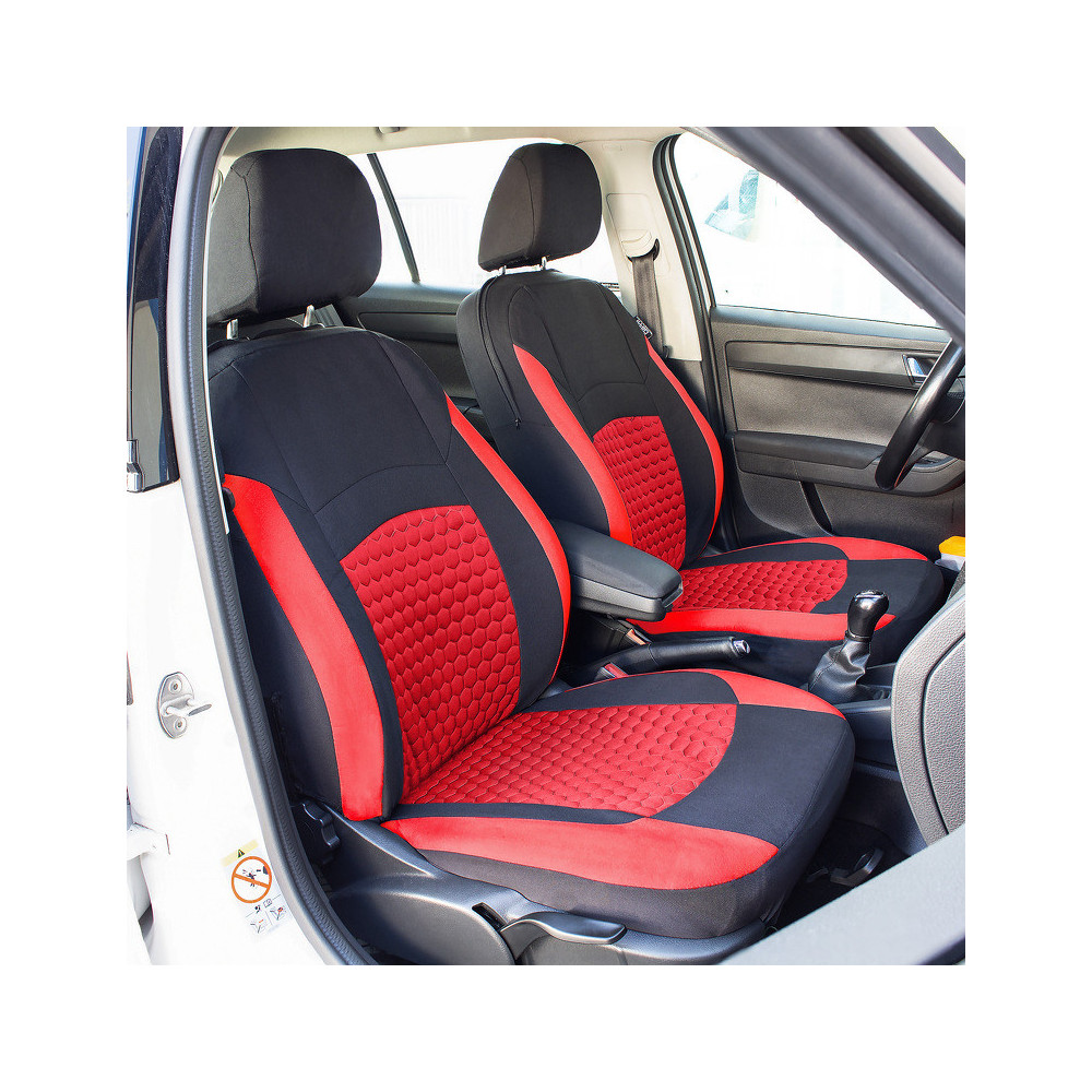 Potahy předních sedadel mají po horní části zip pro opěrky hlavy, který vede až k bokům pro použití se sklápěcími páčkami. Pro instalaci potahů není nutné odnímat přední opěrky hlavy.Spodní část boku sedadel má panel se suchým zipem, který umožní obejmutí spodní sklápěcí páčky.
