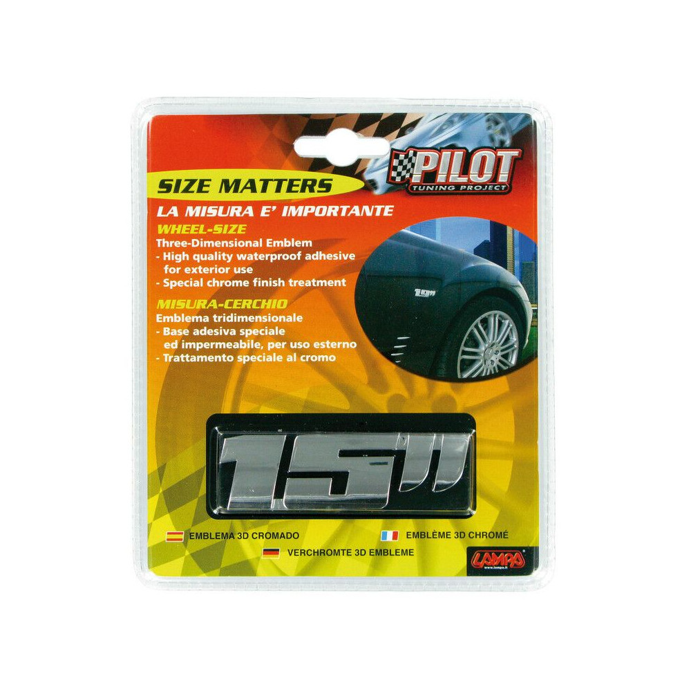 3D emblém s chromovaným vzhledem ve tvaru čísla 15 palců.