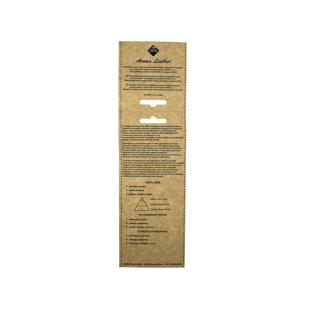 Aroma Leather Tree Cherry je exkluzivní vůně do auta vyrobená z pravé hovězí kůže. S francouzským parfémem (mandle, banán, višeň, malina, pižmo, vanilka, kokos) je ideální pro auto i domácnost. Vyrobeno v České republice.