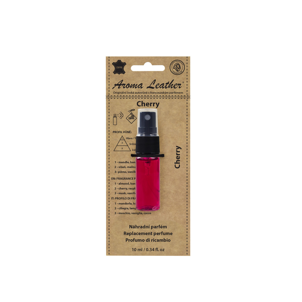 Aroma Leather Tree Cherry je exkluzivní vůně do auta vyrobená z pravé hovězí kůže. S francouzským parfémem (mandle, banán, višeň, malina, pižmo, vanilka, kokos) je ideální pro auto i domácnost. Vyrobeno v České republice. Set s 10ml náhradního parfému.