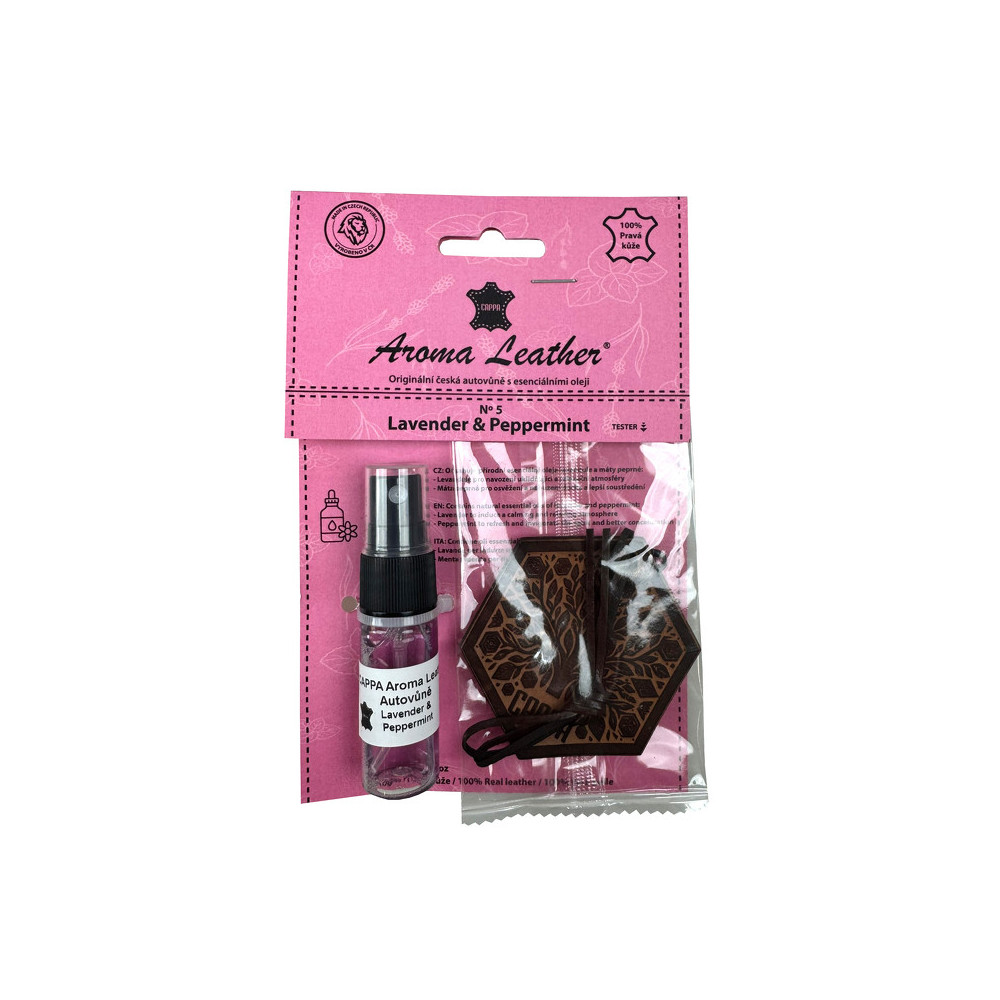 Aroma Leather Tree Lavender & Peppermint je exkluzivní vůně do auta vyrobená z pravé hovězí kůže. S příměsí esenciálních olejů levandule a máty. Ideální pro auto i domácnost. Vyrobeno v České republice. Set s 10ml náhradního parfému.