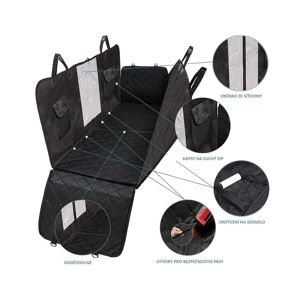 Potah do auta pro ochranu zadních sedaček a dveří automobilu při přepravě zvířat, nářadí, materiálu, apod. Nepropustný materiál. Snadná a rychlá montáž na opěrky hlavy.