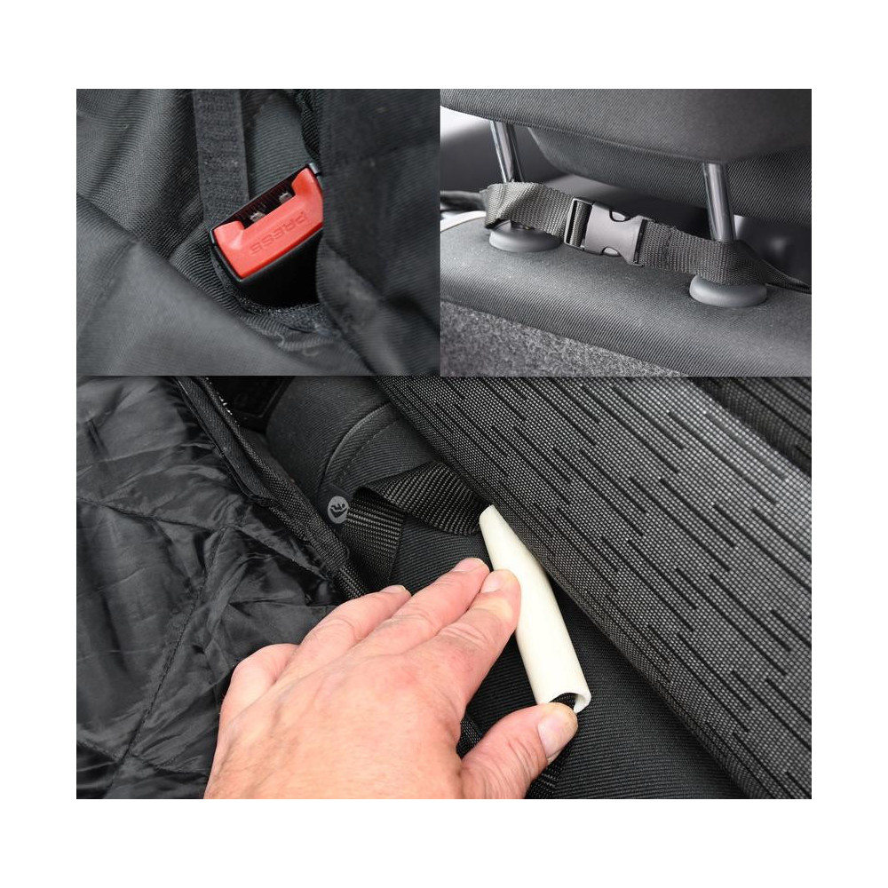 Prošívaný, vícevrstvý materiál zajišťuje pohodlné cestování psa. Deka ochrání i zadní stranu předních sedadel, a navíc i boční strany sedadel, díky uším na bocích. Deka je opatřena otvory pro bezpečnostní pásy, uzavíratelné na suchý zip.