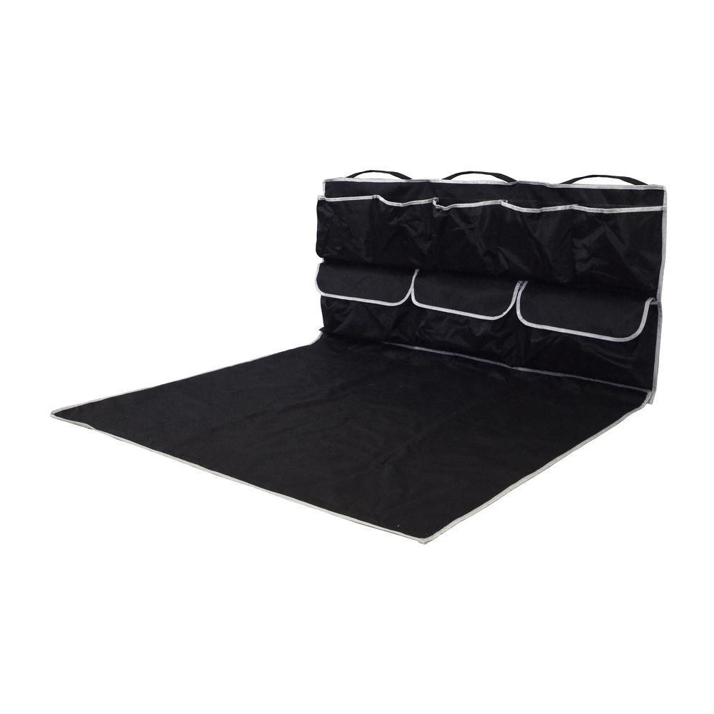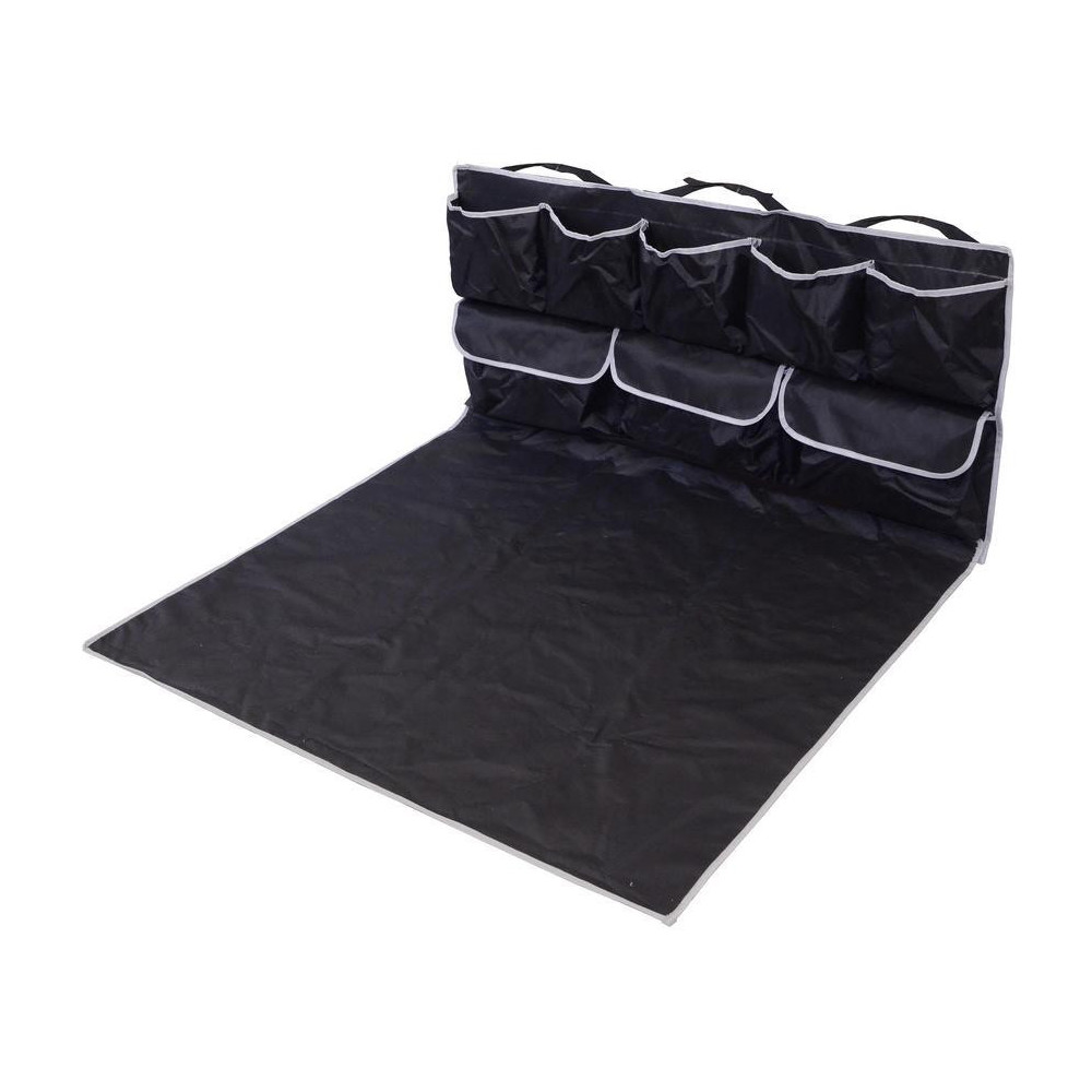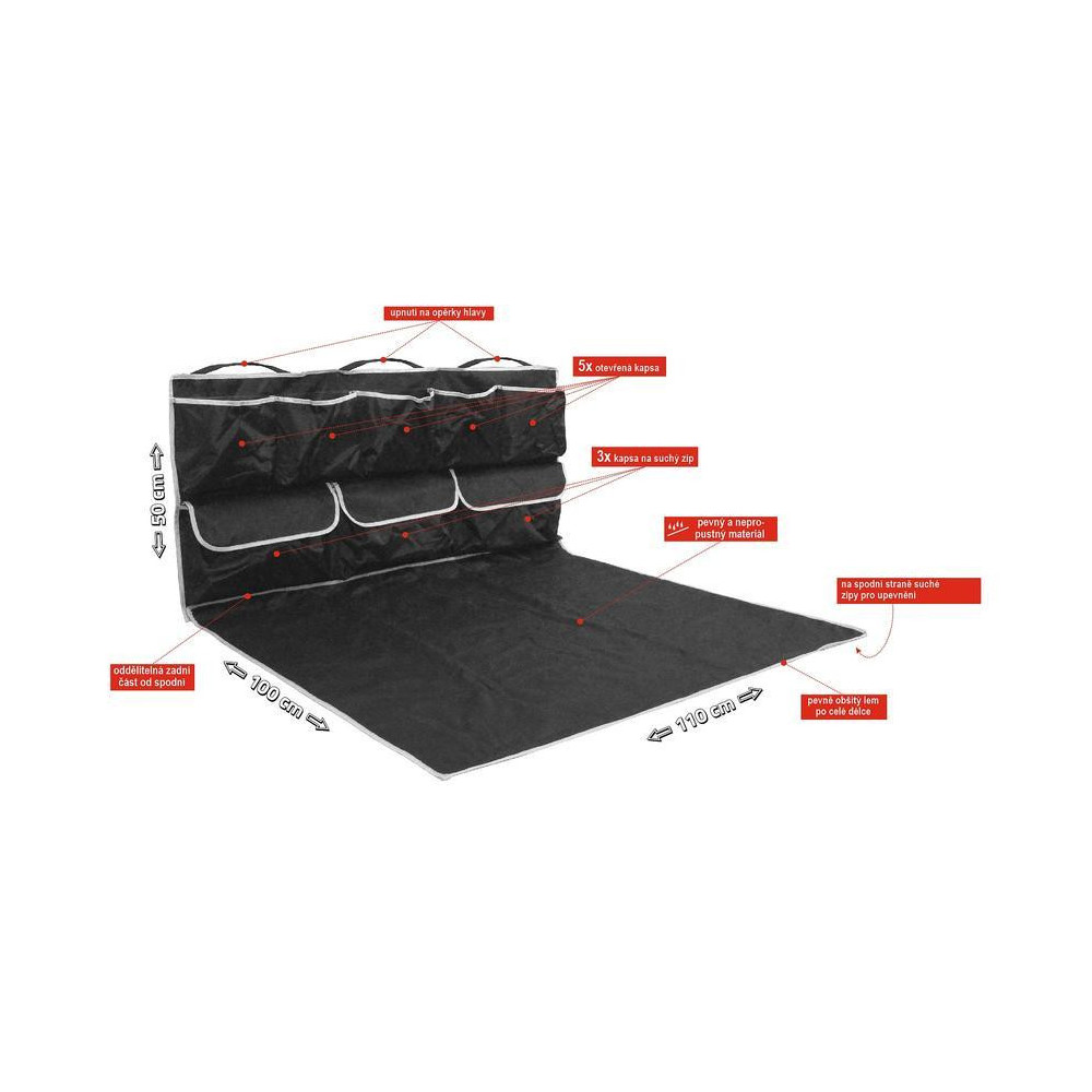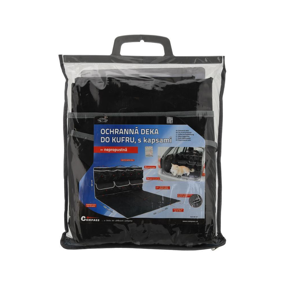 Ochranná deka do kufru auta, jedinečná konstrukce, která chrání dno i zadní část zavazadlového prostoru a navíc je vybavena celou řadou praktických kapes, včetně uzavíratelných.