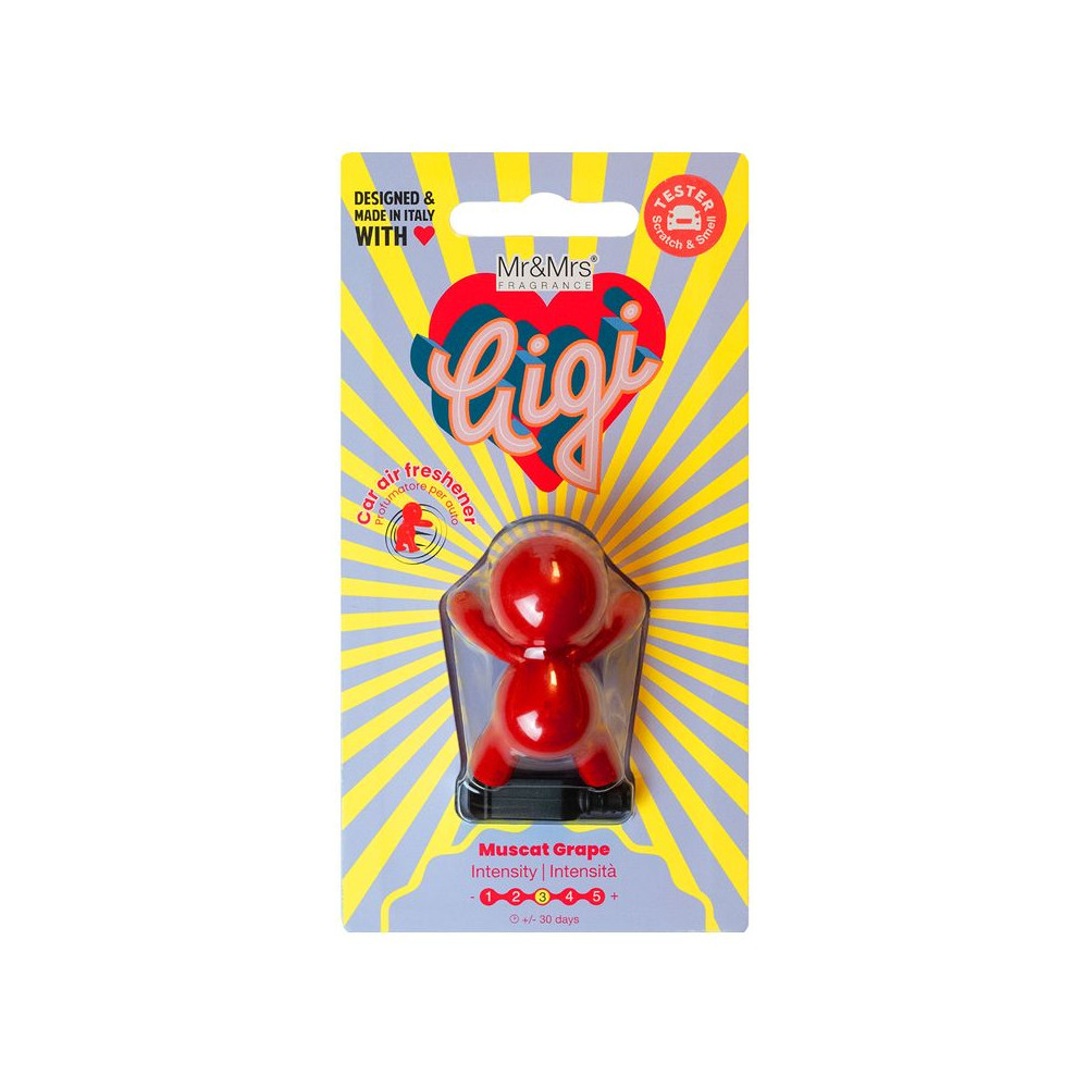 Gigi je osvěžovač vzduchu do auta, který je výsledkem spolupráce mezi Mr&Mrs Fragrance a slavným návrhářem Stefano Giovannoi (Qeeboo). Je k dispozici v šesti barvách a šesti vůních, do kterých se zamilujete.