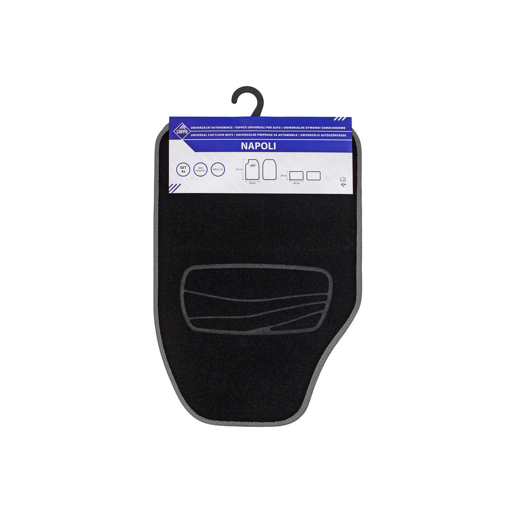 Univerzální textilní autokoberce NAPOLI jsou řešením pro každého, kdo chce ochránit podlahu svého vozu a zároveň přidat do interiéru atraktivní a funkční prvek. Koberce jsou navrženy pro snadnou montáž a pasují do většiny osobních automobilů, díky čemuž se stanou univerzální volbou pro širokou škálu vozidel. Dodávají se v 4 ks balení, což zahrnuje 2 přední a 2 zadní kusy, které zajistí kompletní ochranu podlahy v celém vozidle.