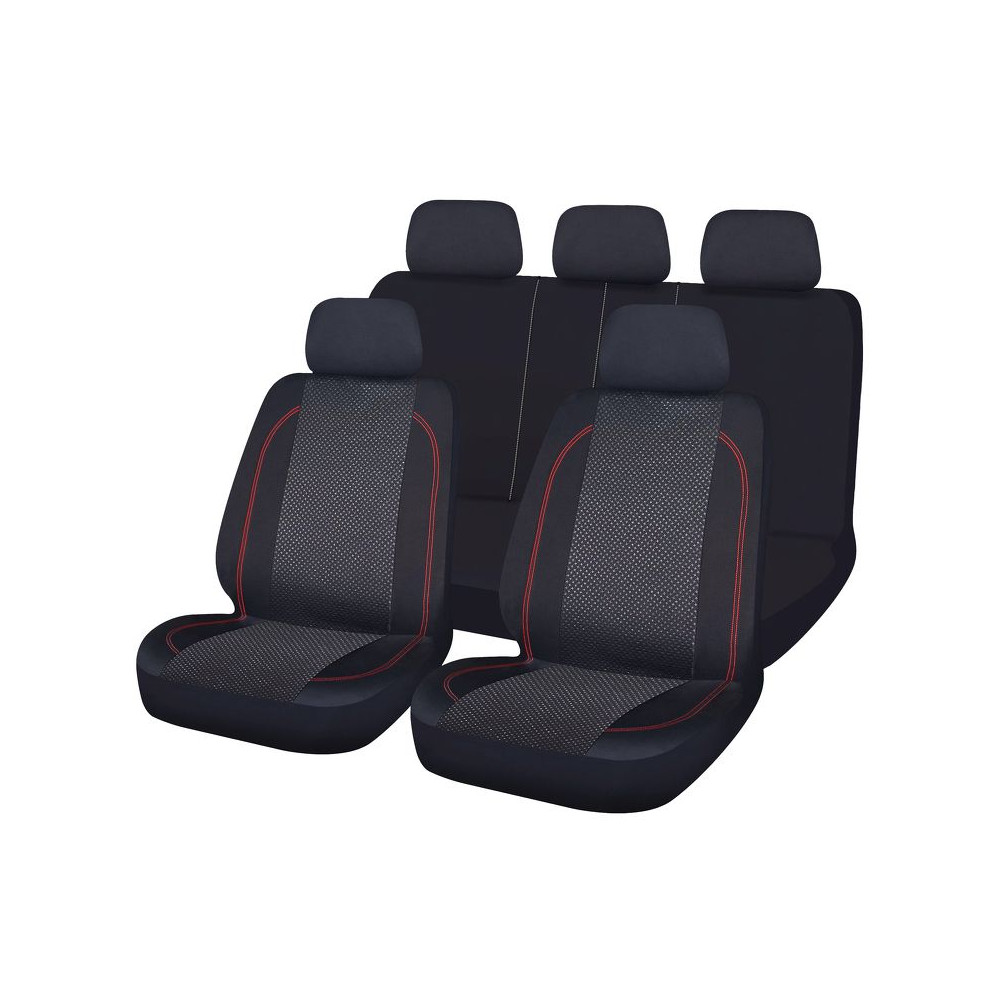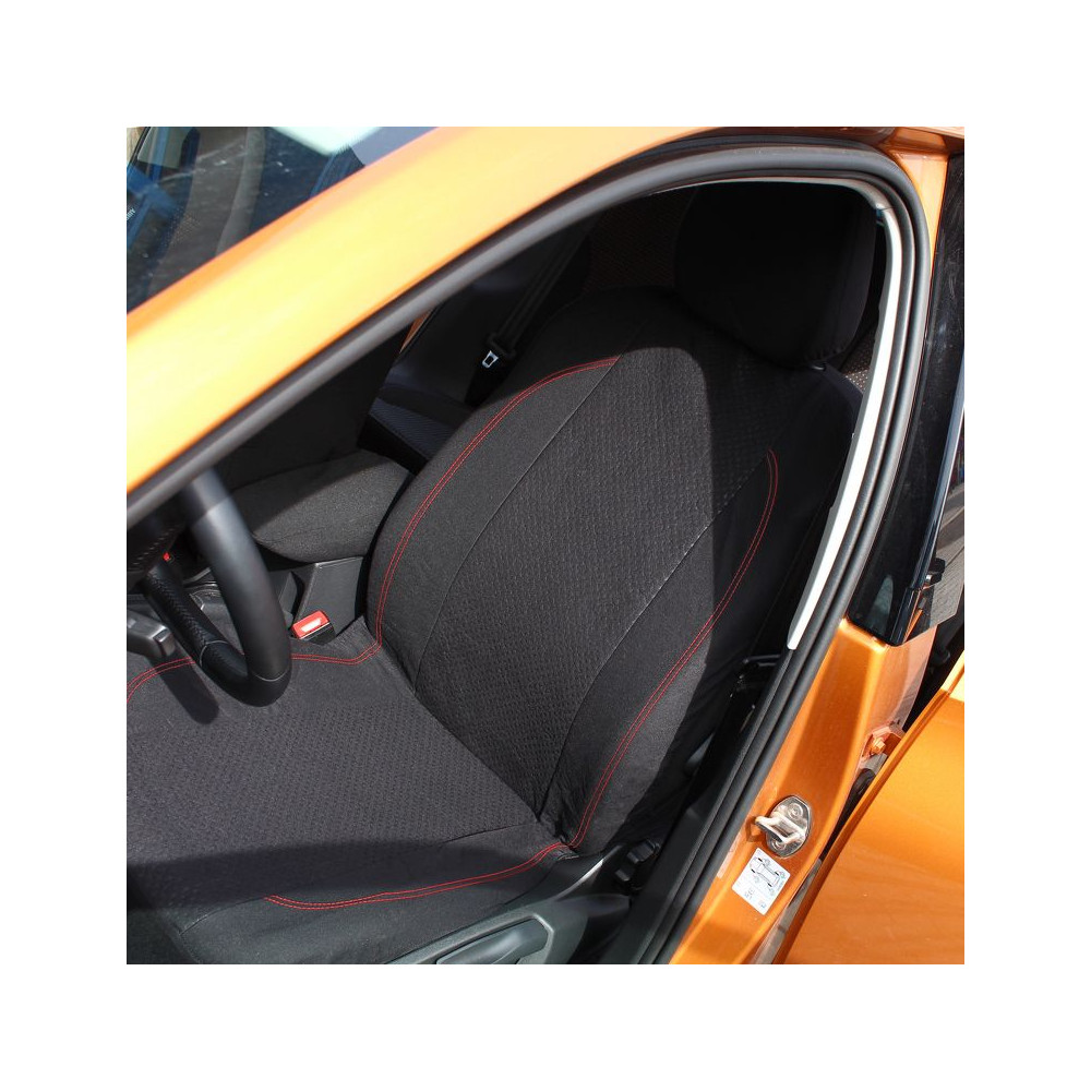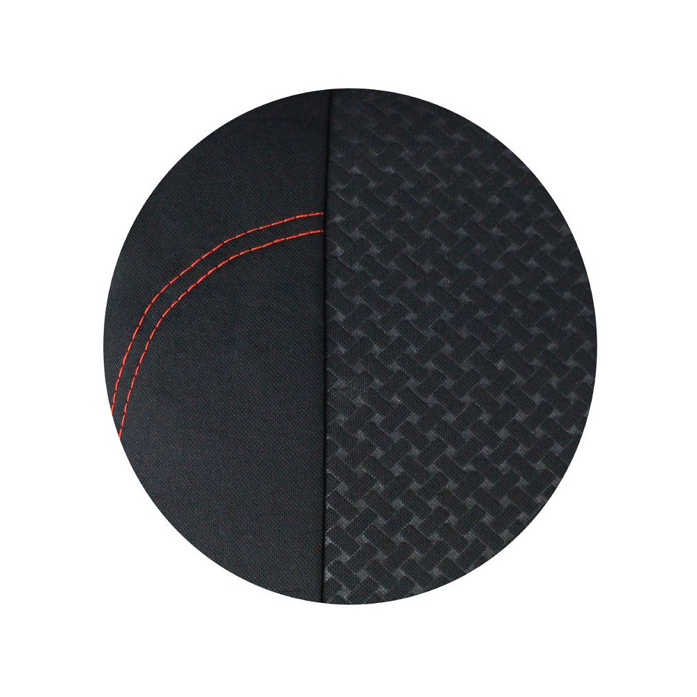 Autopotahy neklouzají po sedadle díky měkkému molitanu na vnitřní straně potahu. Střed, lemování a záda jsou vyrobeny z prošívané polyesterové tkaniny. Boky z elastického polyesteru s červeným prošitím na předních sedadlech.