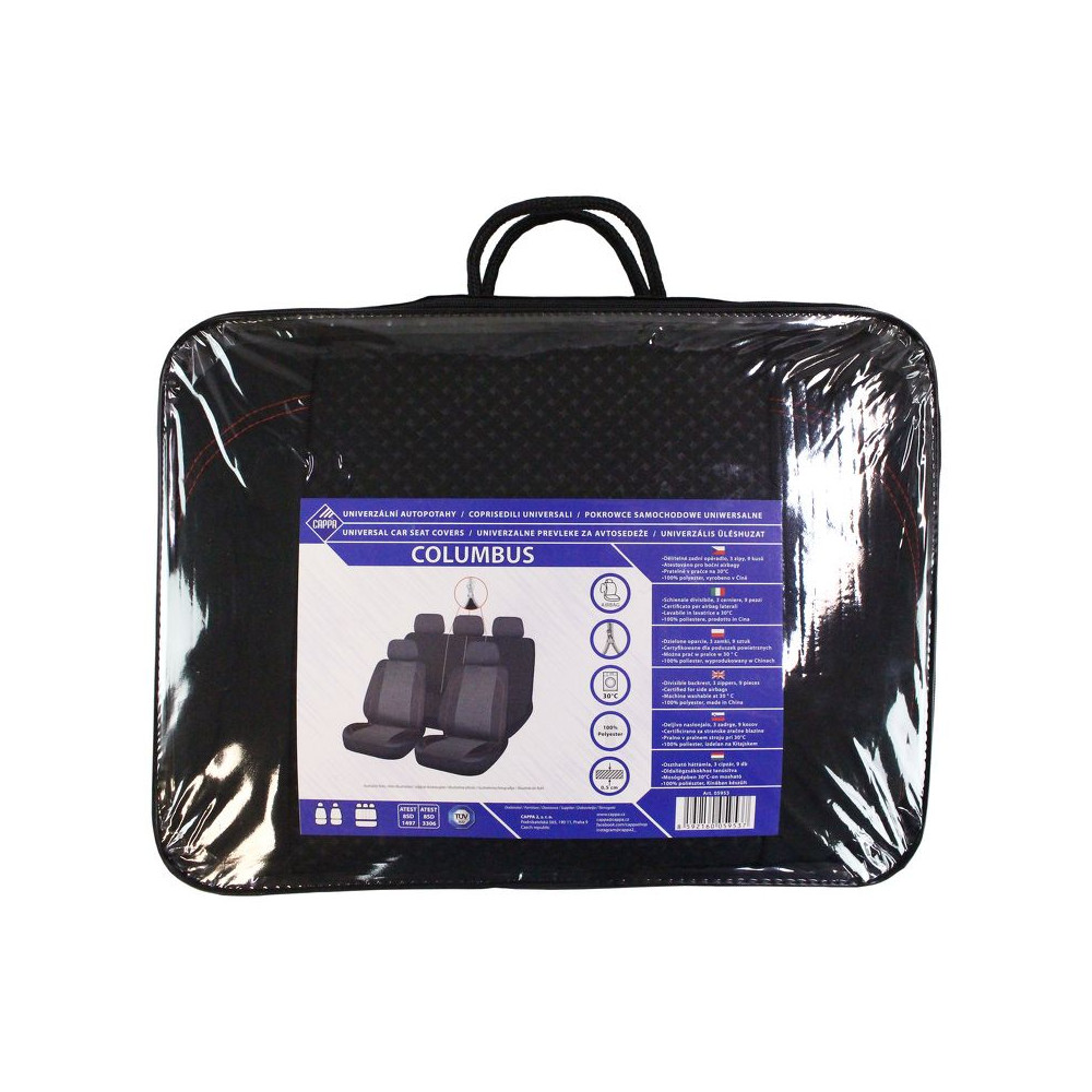Univerzální autopotahy Columbus, sada pro 5 sedadel. Prošívaný polyester + pěna (0,5cm). Pro dělitelná i nedělitelná zadní sedadla v poměru 1/3 na obě strany i 50/50. Včetně opěrek hlavy, homologováno pro boční airbagy.