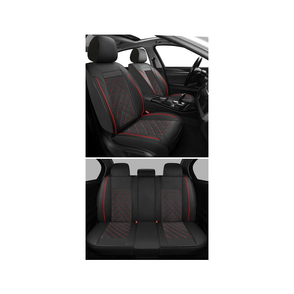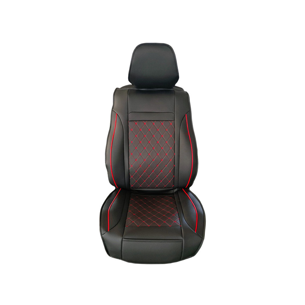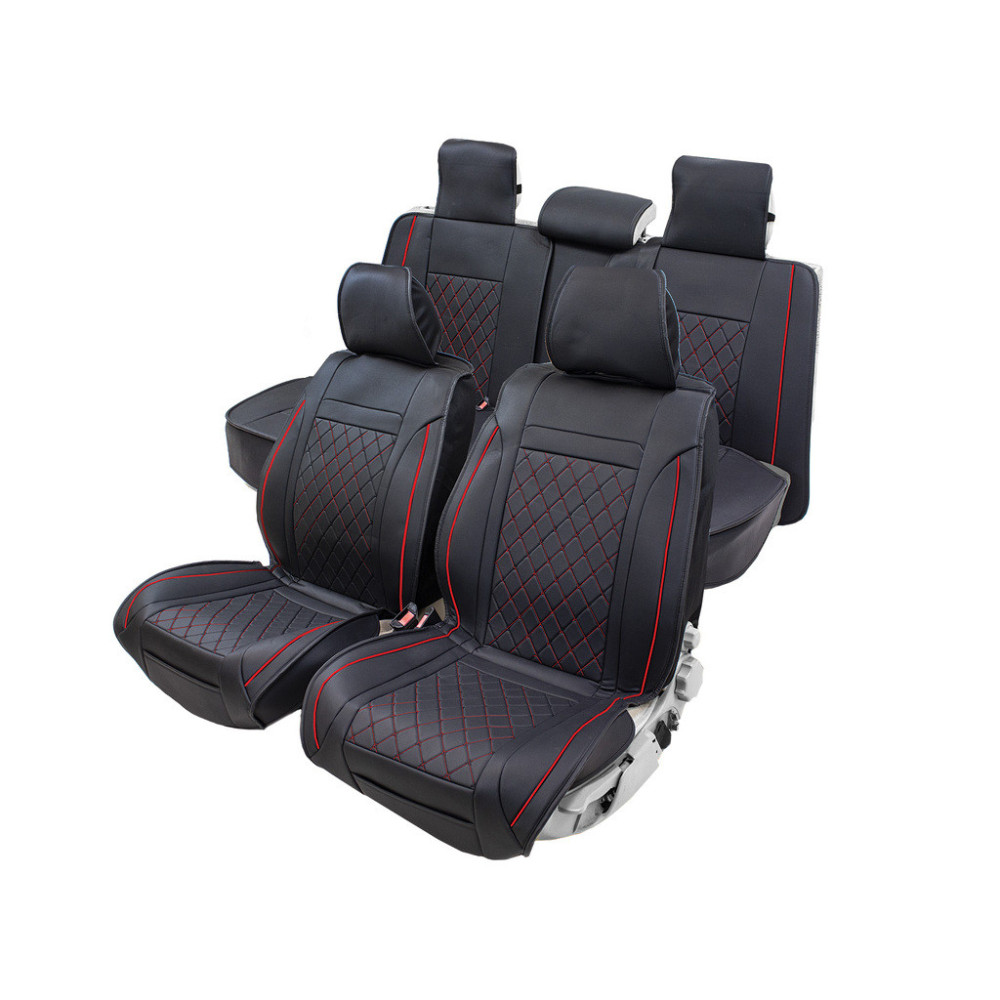 Univerzální autopotahy, sada pro 5 sedadel. Eko kůže. Homologovány pro boční airbagy. Včetně opěrek hlavy, vhodné pro sklopná sedadla, zadní loketní opěrku a 3. bezp. pás. Černo-červená barva.