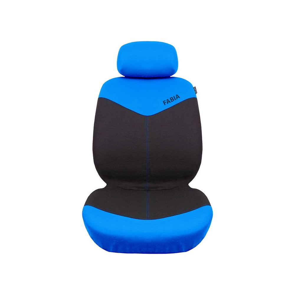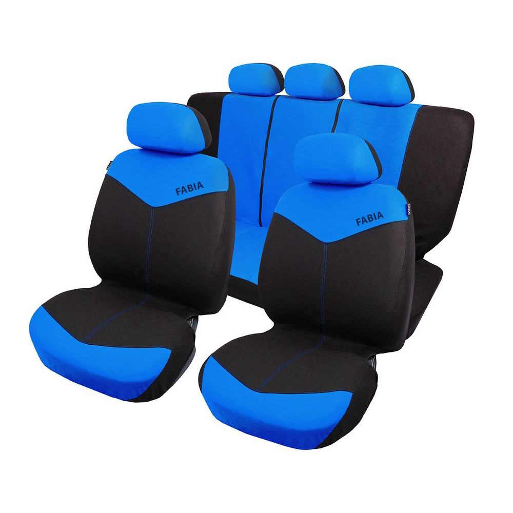 Autopotahy DG s výšivkou FABIA, polyester + pěna, sada pro 5 sedadel, pro dělitelná i nedělitelná zadní sedadla v poměru 1/3 na obě strany, včetně opěrek hlavy, homologováno pro boční airbagy, barva černá/modrá.