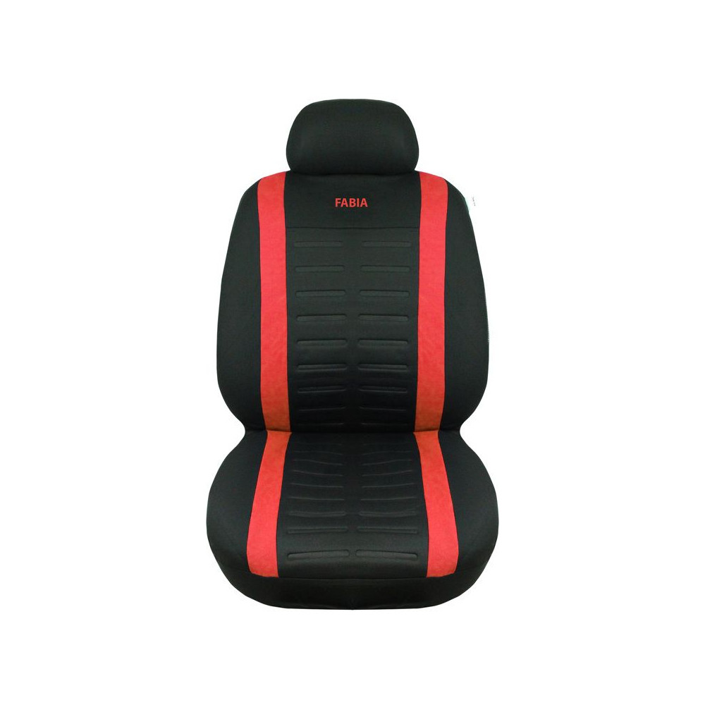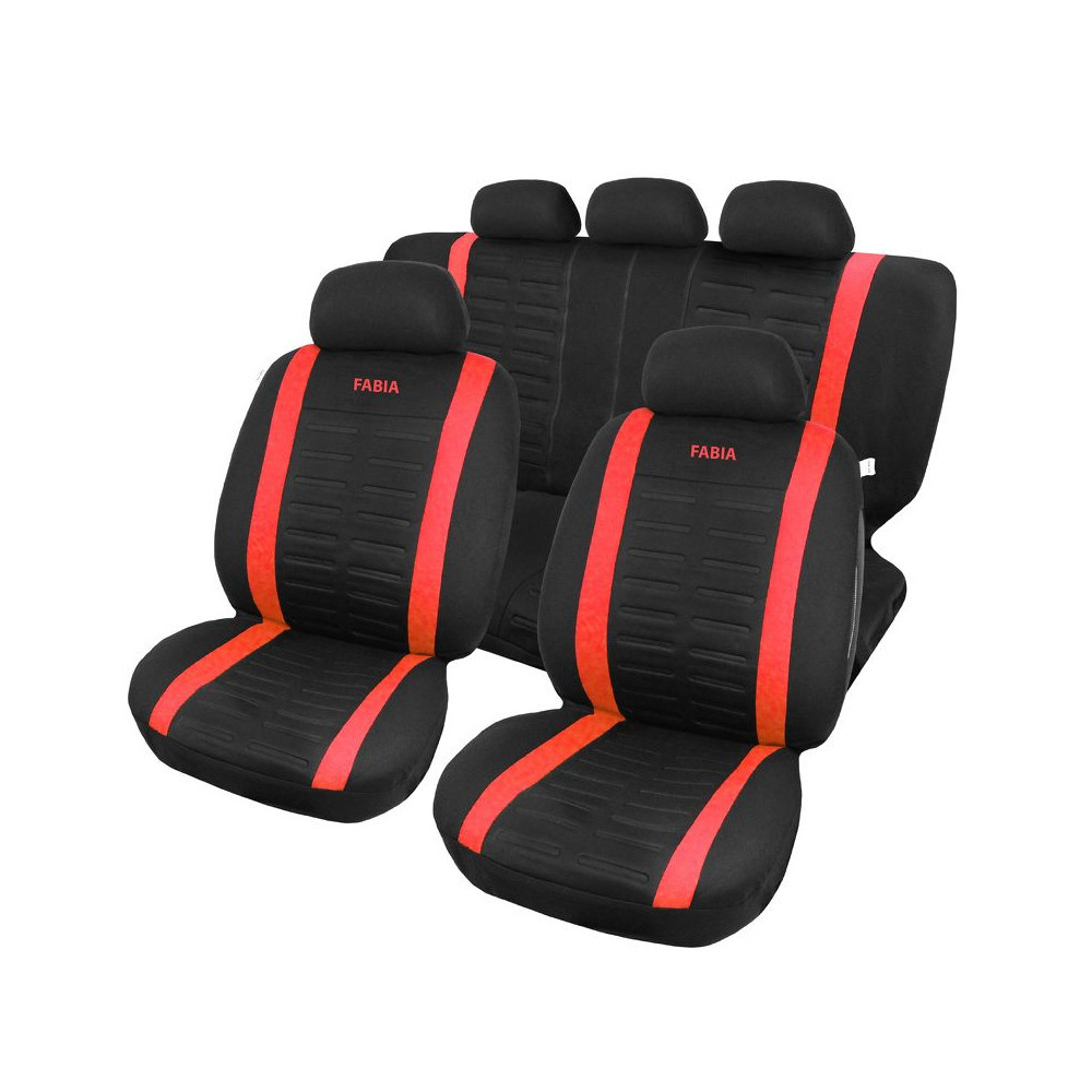 Autopotahy s výšivkou FABIA, polyester + pěna, sada pro 5 sedadel, pro dělitelná i nedělitelná zadní sedadla v poměru 1/3 na obě strany nebo 50/50, včetně opěrek hlavy, homologováno pro boční airbagy, 3 zipy na zadních opěradlech.