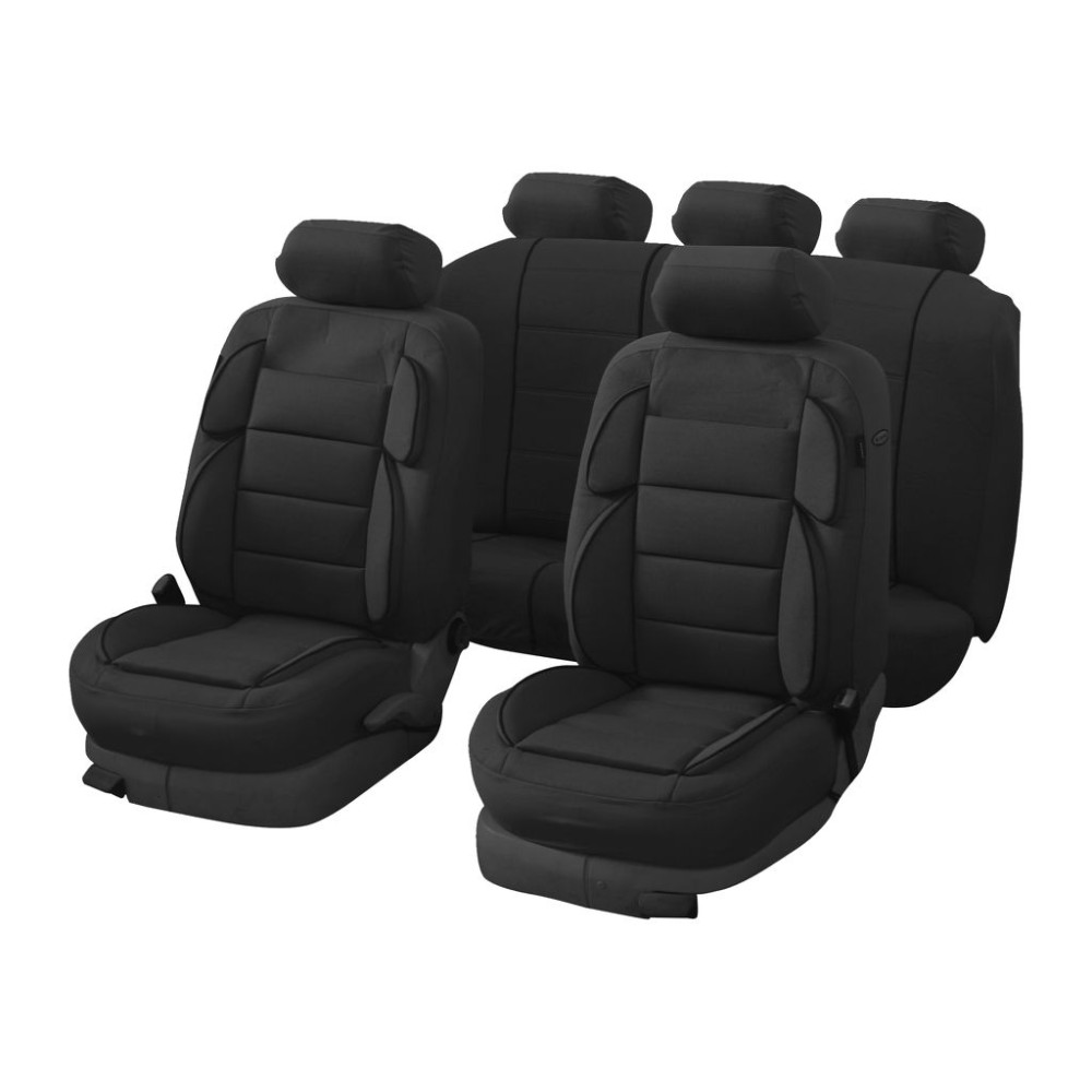 Univerzální autopotahy Yaseen, sada pro 5 sedadel, střih LIMA. Prošívaný polyester. Pro dělitelná zadní sedadla v poměru 1/3 i nedělitelná zadní sedadla. Včetně opěrek hlavy, homologováno pro boční airbagy. Vhodné pro sklopná sedadla, zadní loketní opěrku a 3. bezp. pás.