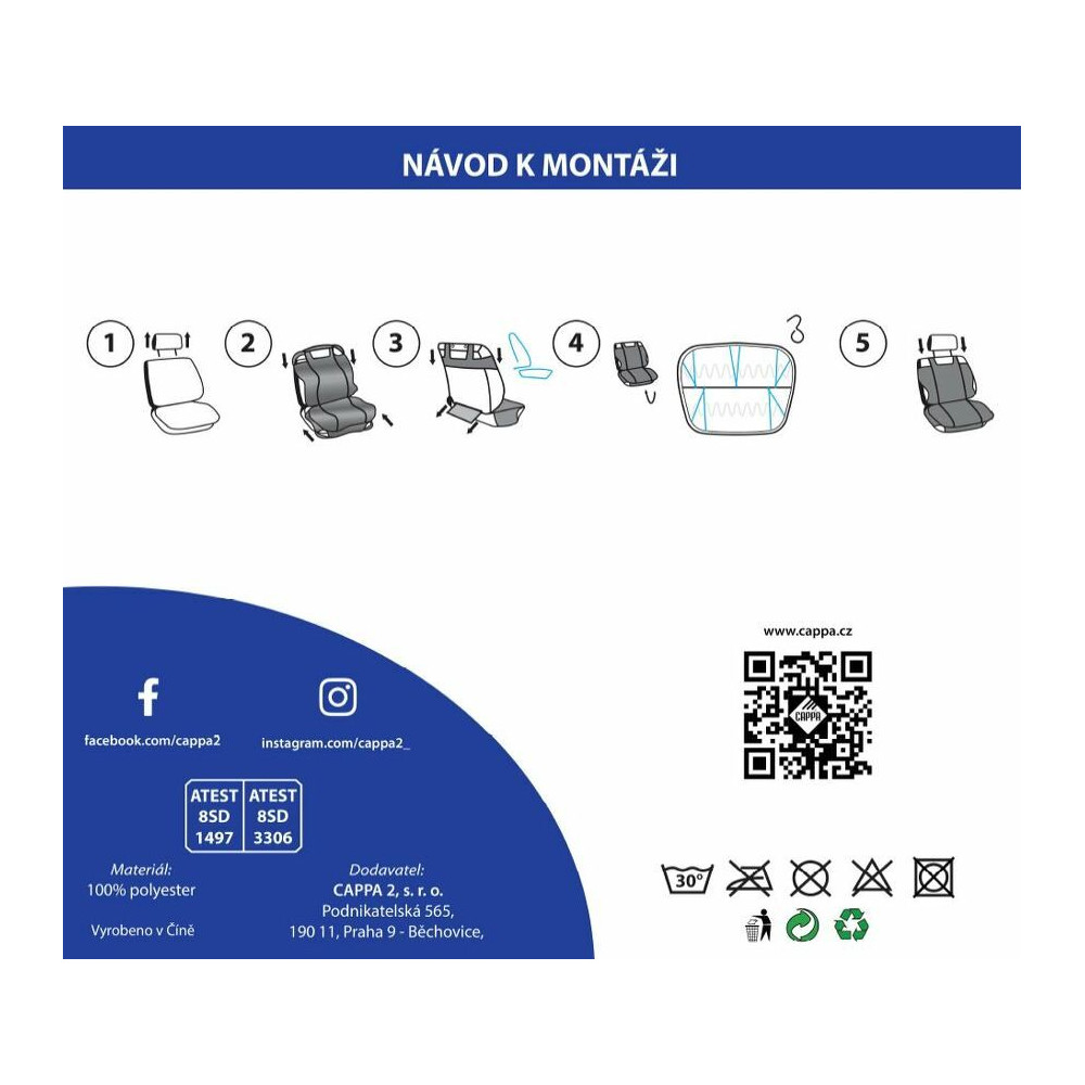 Výhodou těchto autopotahů je univerzální velikost, velmi snadná a rychlá montáž. Lze požít na typy vozidel s bočními airbagy i bez nich. Autopotah lze prát v pračce na 30°.