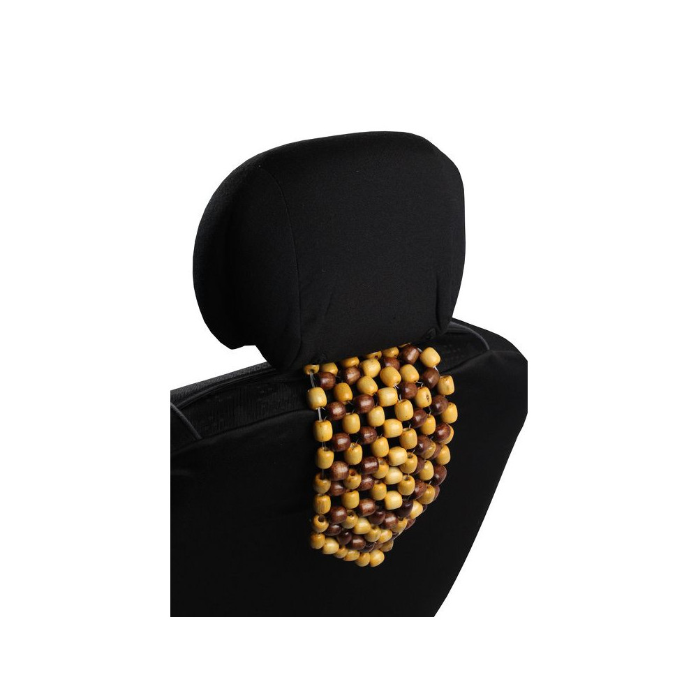 Masážní potah sedadla automobilu s dřevěnými korálky a s univerzálním systémem upevnění pod opěrku hlavy. Rozměry: 40×130 cm.
