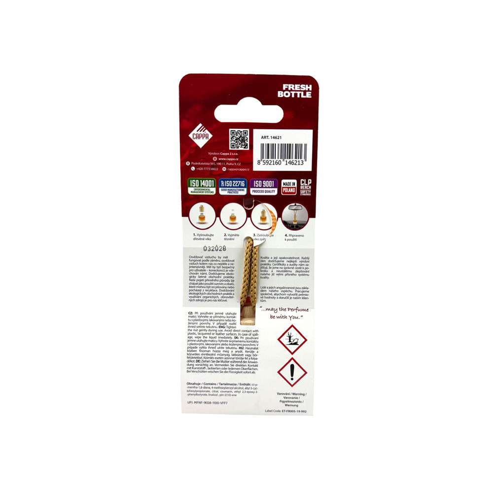 Díky dřevěnému víčku se vůně uvolňuje pomalu a rovnoměrně, takže vaše okolí zůstane provoněné po dlouhou dobu. Celý produkt je navržen s ohledem na přírodu – balení neobsahuje žádné plasty, je snadno vystavitelné a intuitivní na testování.